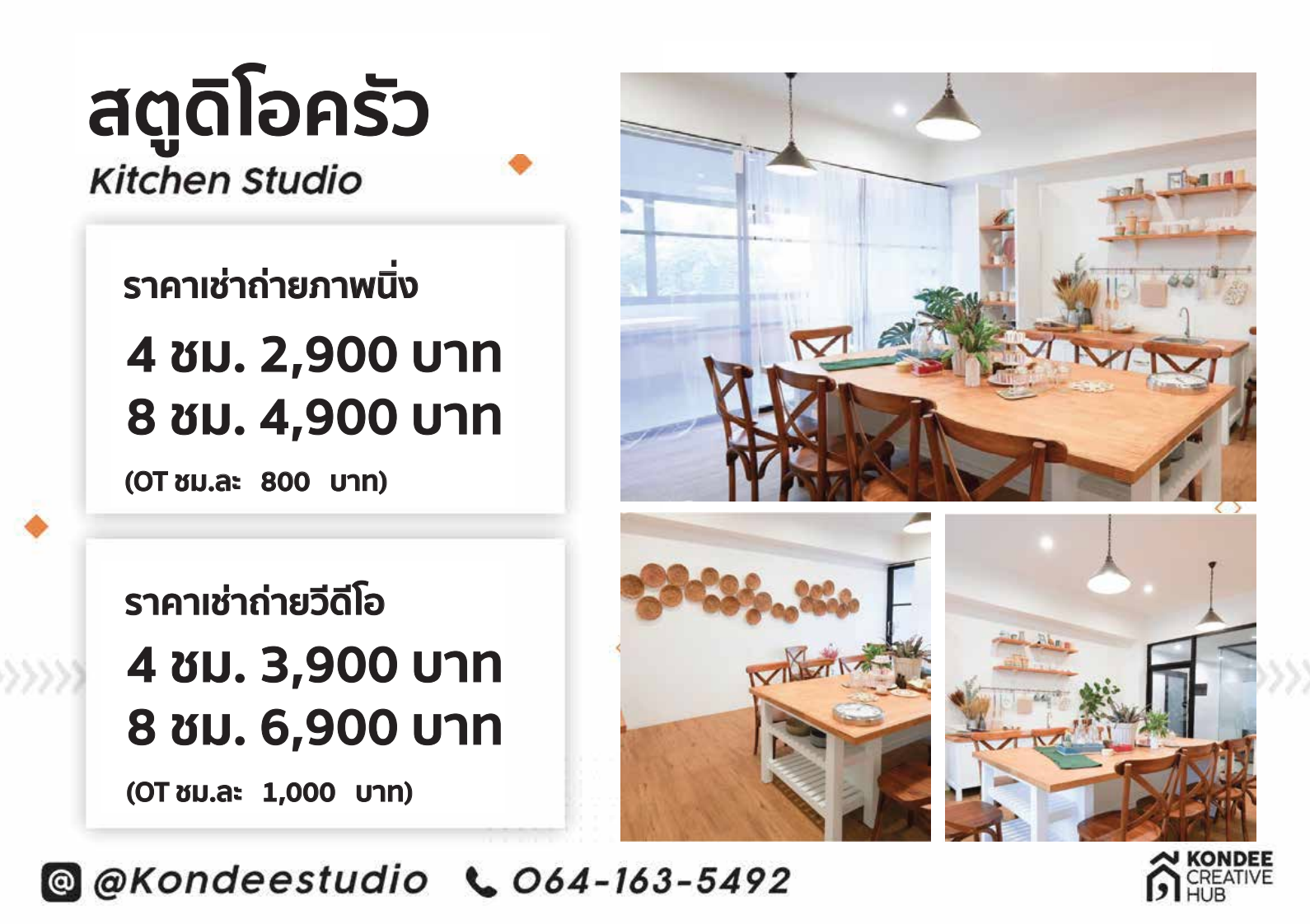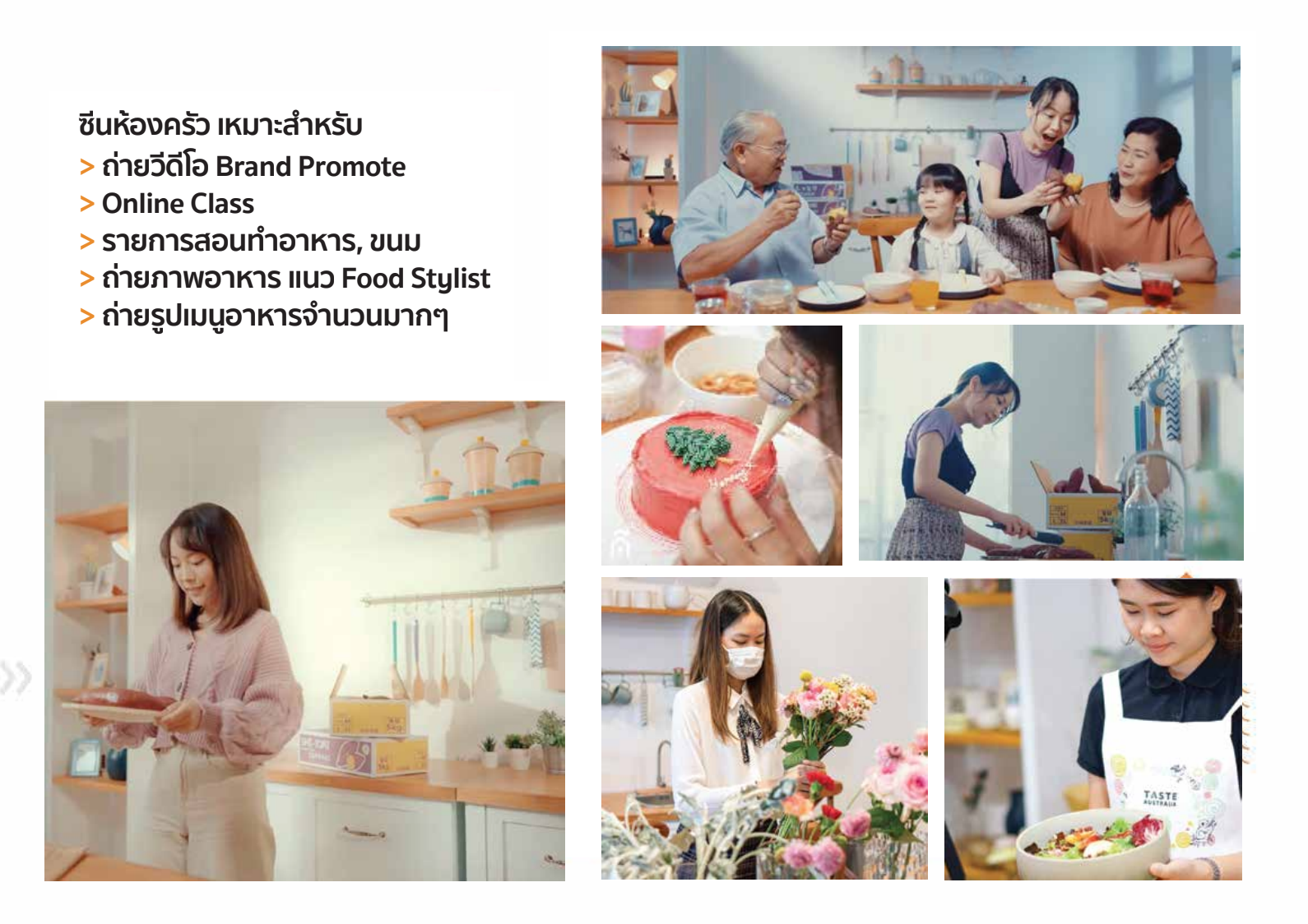 สตูดิโอครัว สไตล์ Contemporary ห้องครัวที่ผสมผสานสีน้ำตาลธรรมชาติเข้ากับสีขาว อย่างเรียบง่ายลงตัว ให้ความรู้สึกอบอุ่น Mix and Match ง่าย พร้อมอุปกรณ์ พร็อพต่าง ๆ ให้เลือกใช้มากมาย และใช้งานได้จริง สามารถโยกย้าย และ เติมพร็อพให้เหมาะสมกับ Mood & Tone ของวิดีโอ หรือภาพถ่ายนั้นๆ ได้