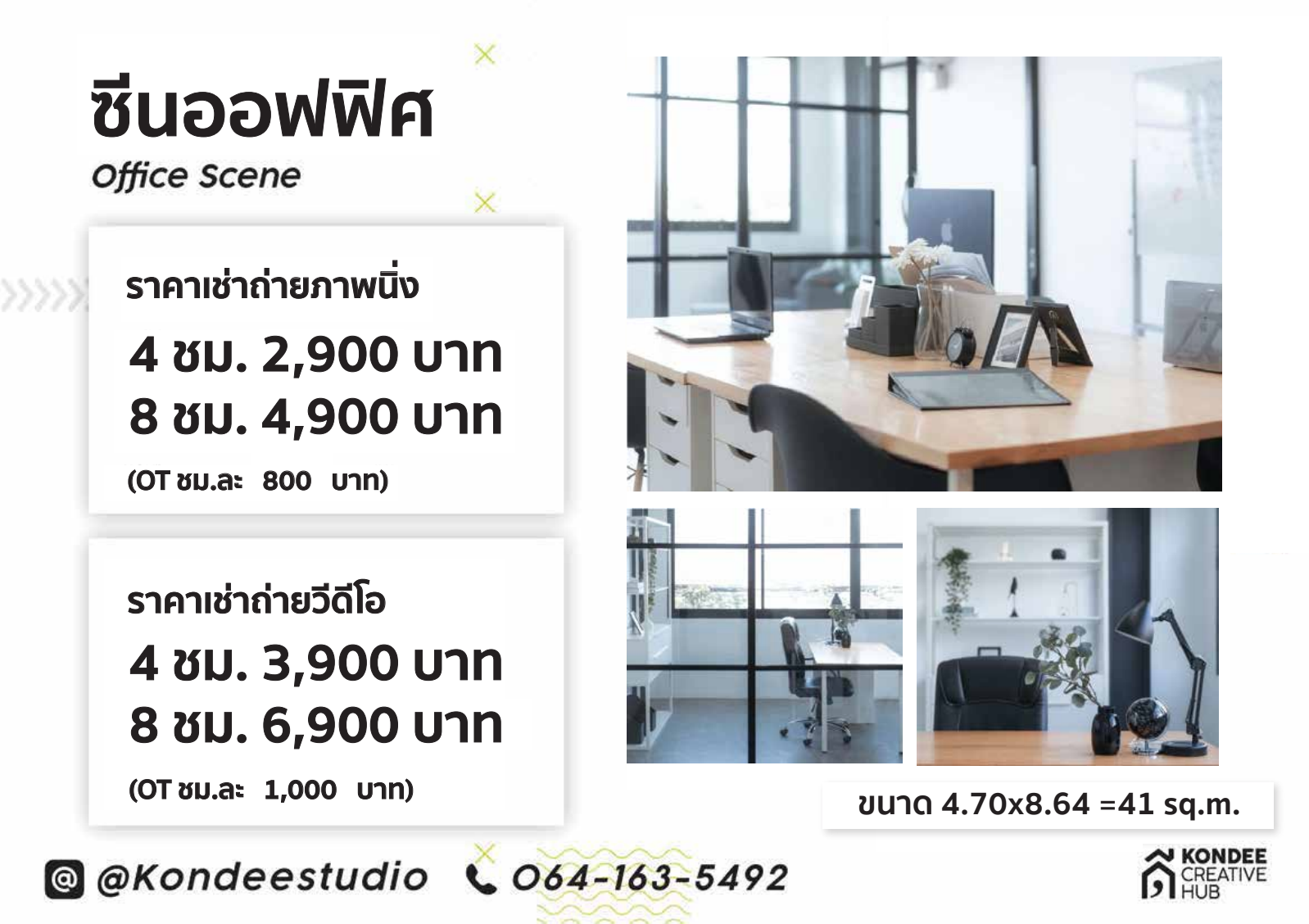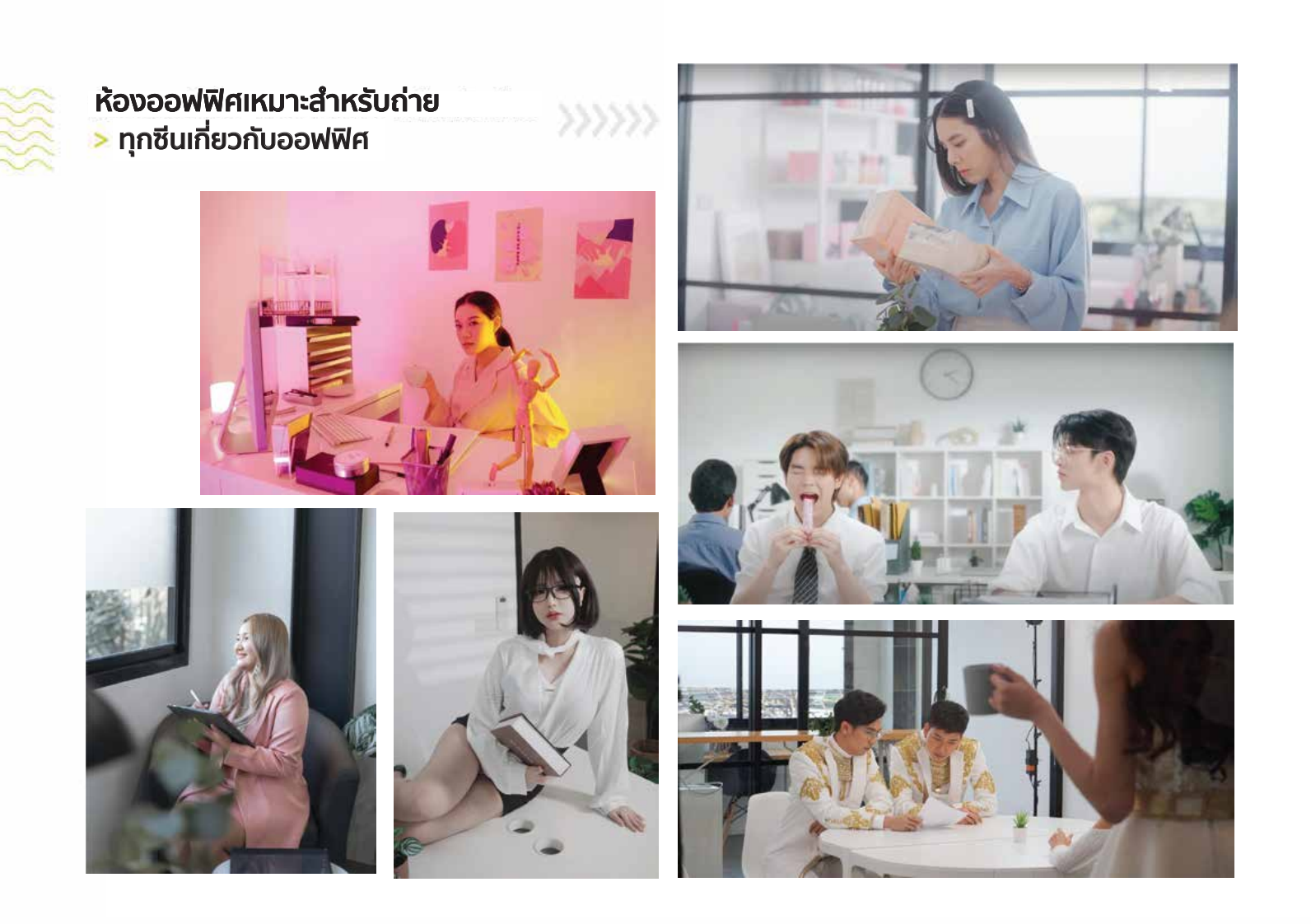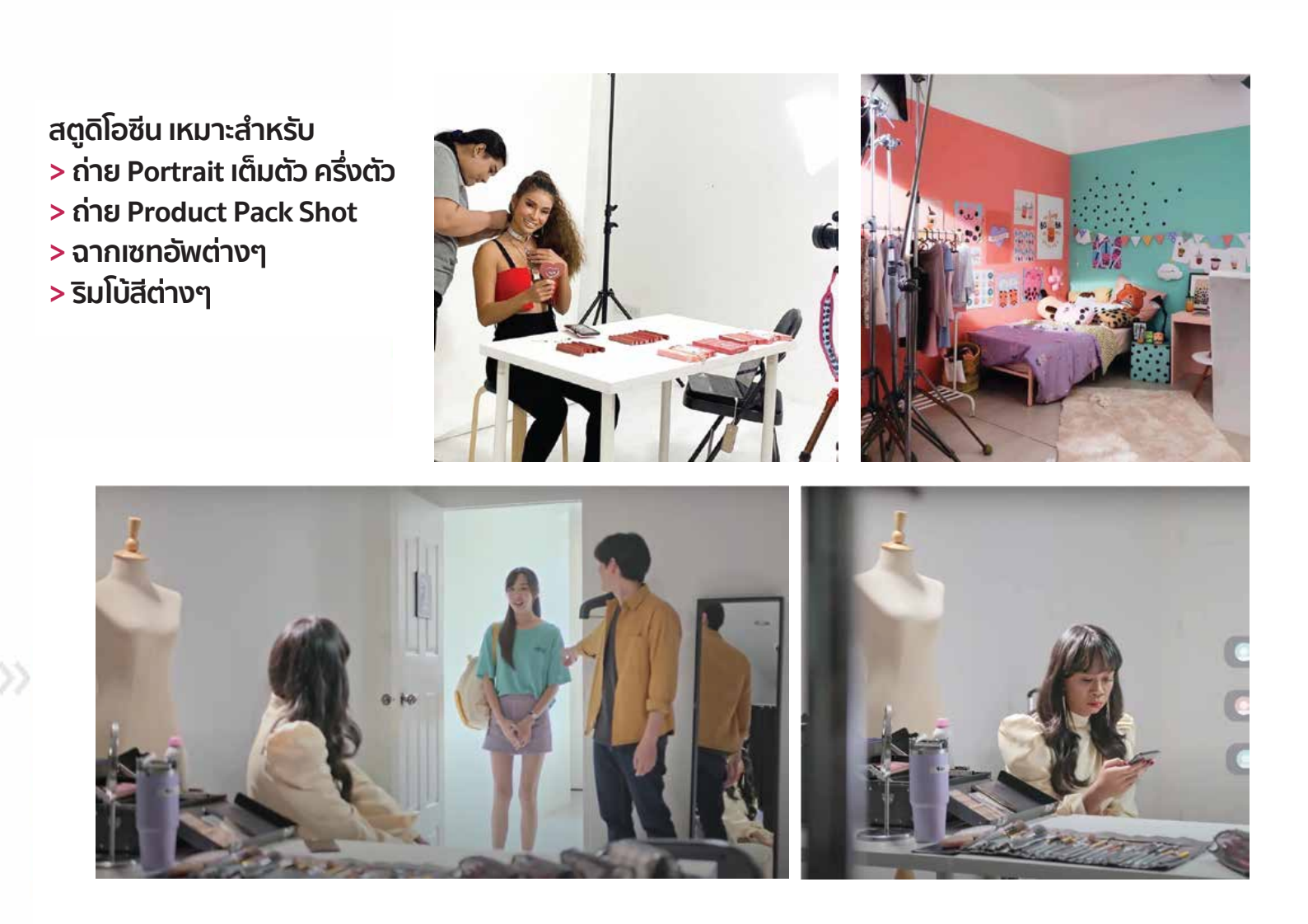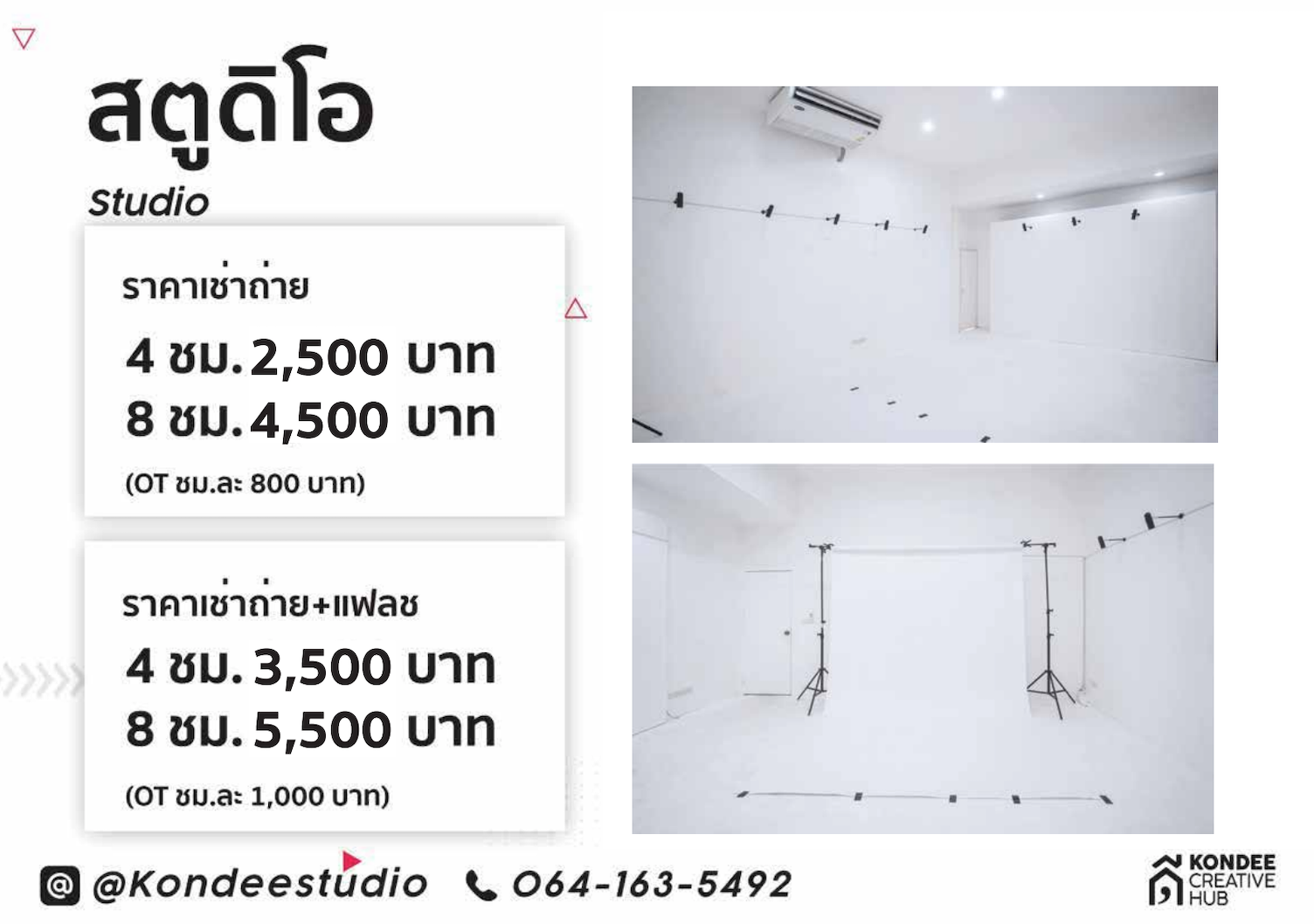 ขนาดมาตรฐาน 5.65x6.90 (39 ตารางเมตร) สามารถเช่า ถ่ายแบบเสื้อผ้า ผลิตภัณฑ์ หรือสื่อโฆษณา คอนเท้นต่าง ๆ พร้อมอุปกรณ์แฟลชพร้อมใช้งาน มีฉากกระดาษพื้น หลังให้เลือกกว่า 9 สี